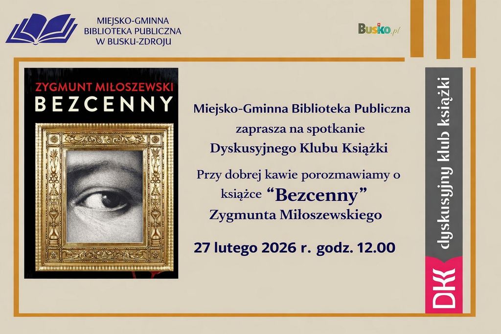 Dyskusyjny Klub Książki zaprasza na kolejne spotkanie, które odbędzie się 27 lutego o godz. 12:00. Tematem rozmowy będzie powieść "Bezcenny" autorstwa Zygmunta Miłoszewskiego.