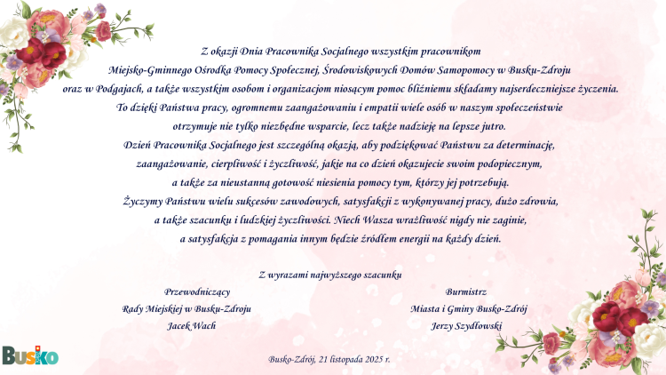 Z okazji Dnia Pracownika Socjalnego wszystkim pracownikom Miejsko-Gminnego Ośrodka Pomocy Społecznej, Środowiskowych Domów Samopomocy w Busku-Zdroju oraz w Podgajach, a także wszystkim osobom i organizacjom niosącym pomoc bliźniemu składamy najserdeczniejsze życzenia. To dzięki Państwa pracy, ogromnemu zaangażowaniu i empatii wiele osób w...