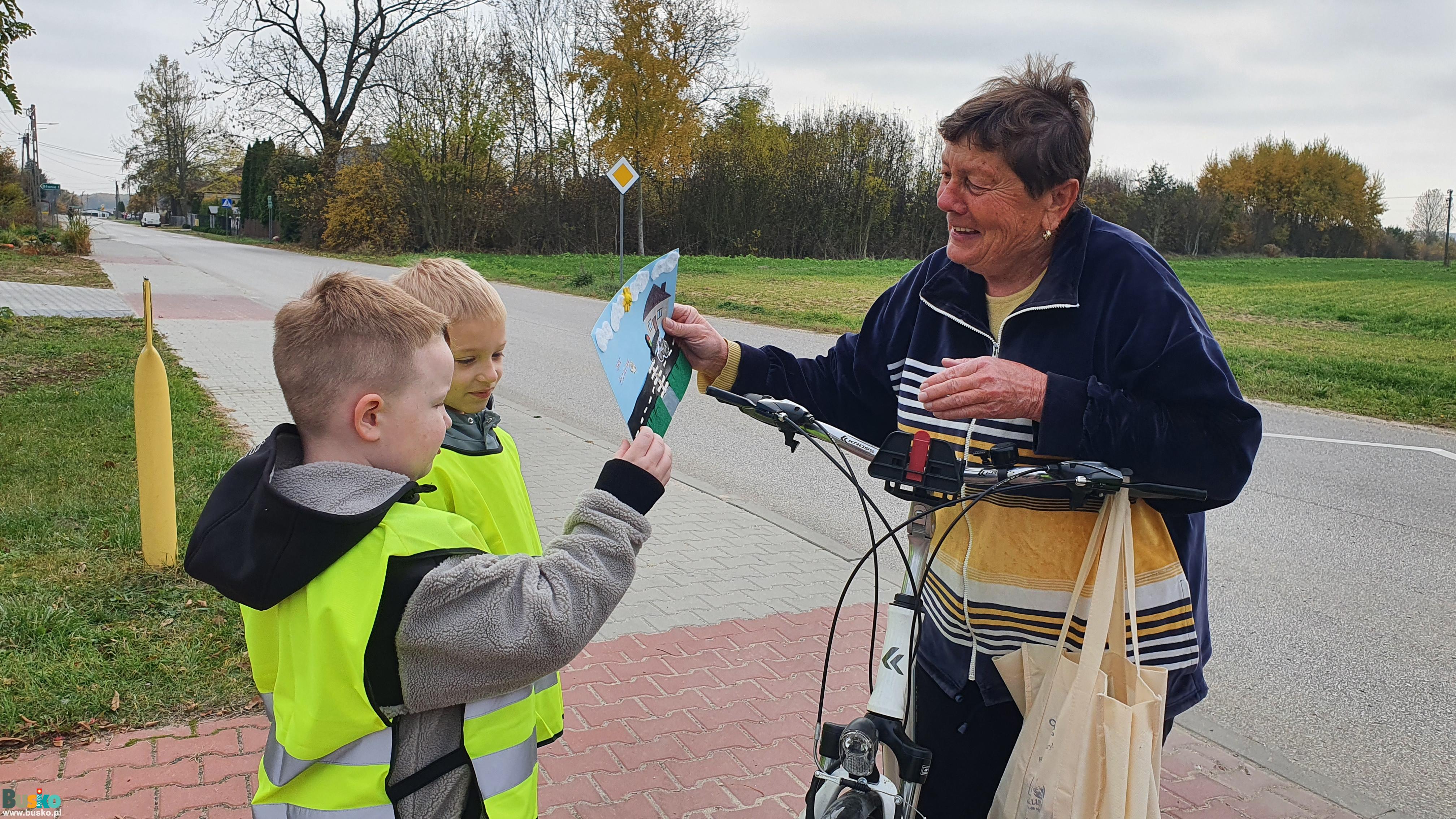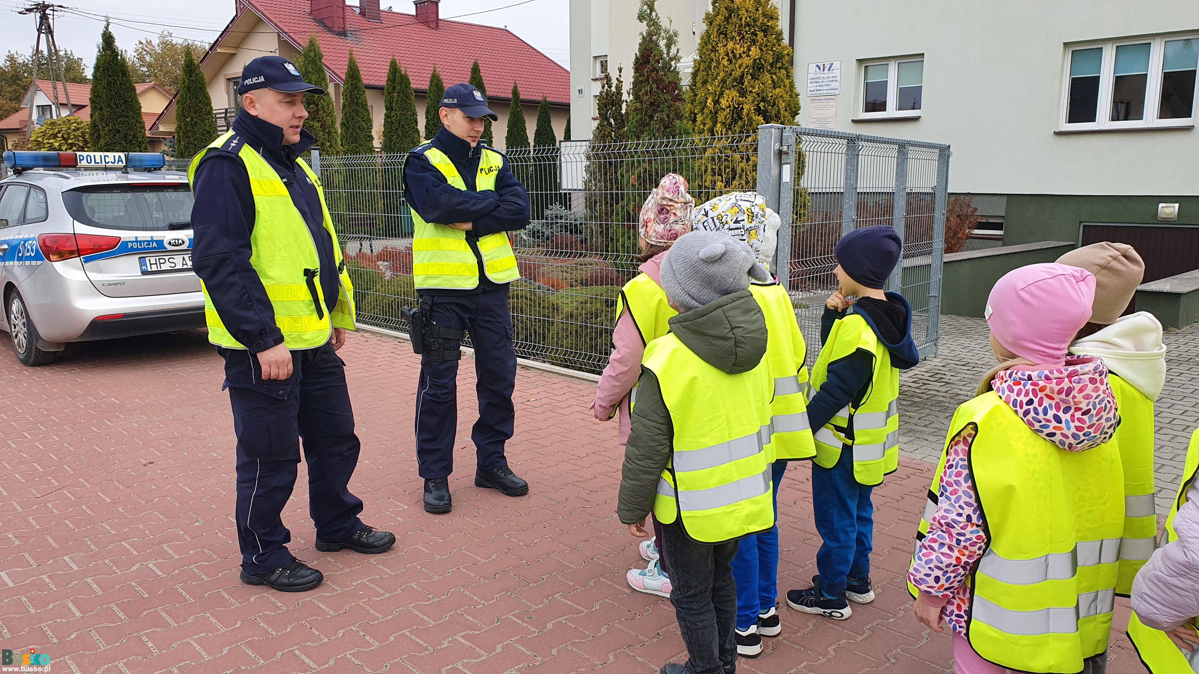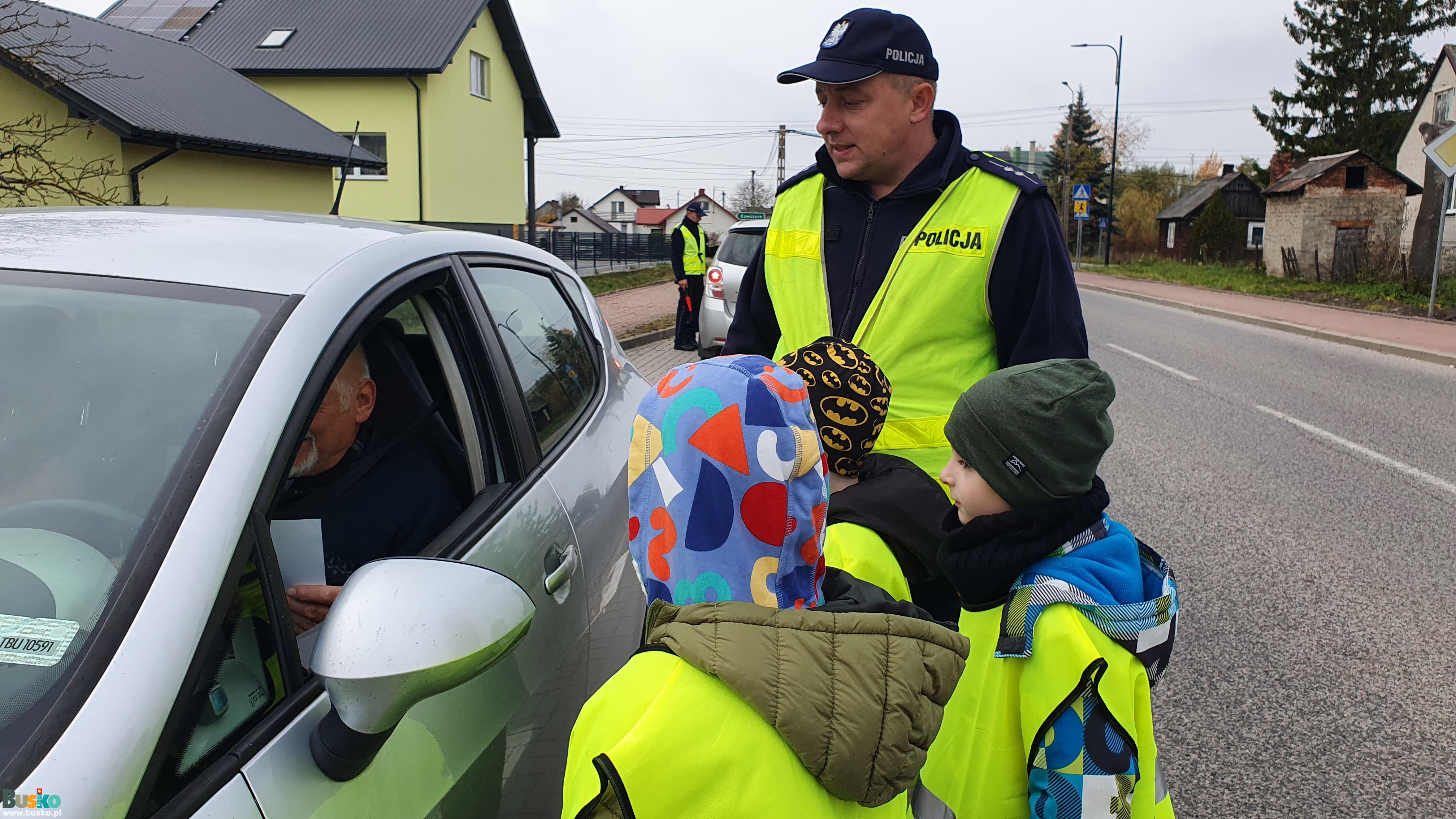 Uczniowie Publicznej Szkoły Podstawowej Nr 3 im. Płk. Aleksandra Krzyżanowskiego „Wilka” w Busku-Zdroju uczestniczący w prewencyjnej akcji terenowej "Bezpieczny pieszy"
