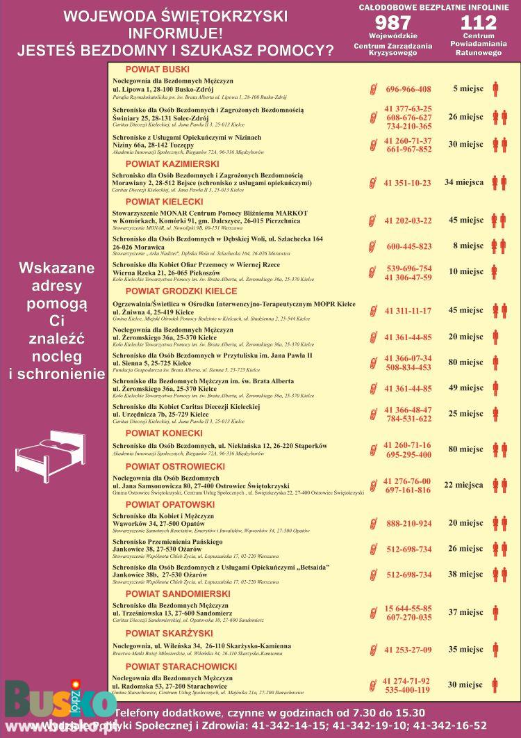 Poniżej zamieszczamy plakat z wykazem placówek udzielających tymczasowego schronienia osobom w kryzysie bezdomności, funkcjonujących na terenie województwa świętokrzyskiego i zgłoszonych przez Gminy do „Rejestru miejsc, w których gmina udziela tymczasowego schronienia w schroniskach dla osób bezdomnych, schroniskach dla osób bezdomnych z usługami opiekuńczymi, noclegowniach oraz ogrzewalniach”, który prowadzi Wojewoda Świętokrzyski.